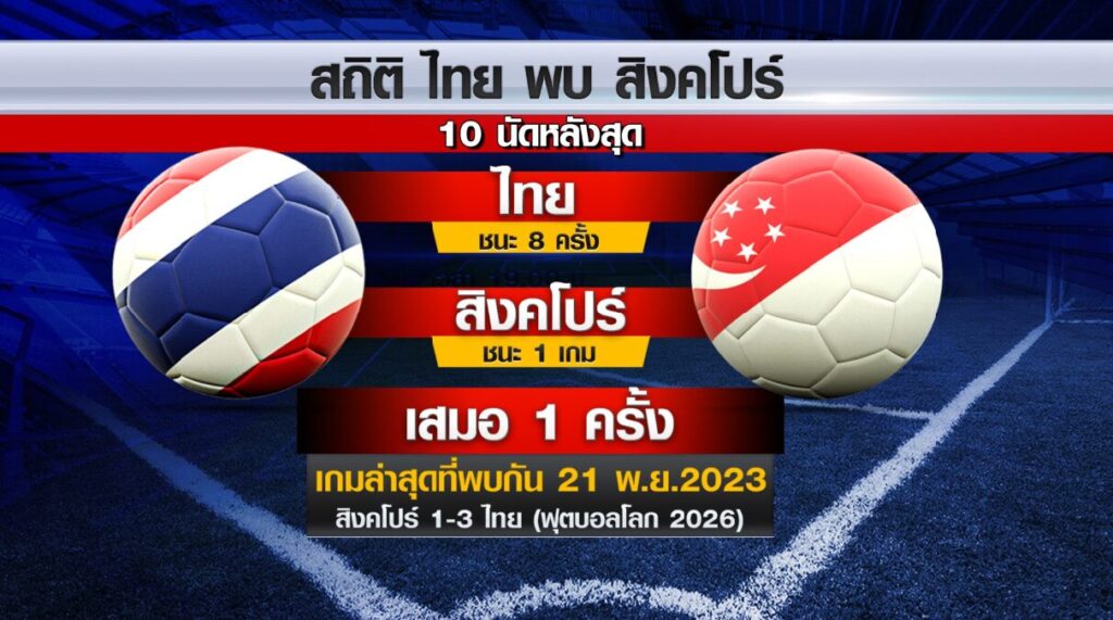 สถิติทีมชาติไทย พบกับ สิงคโปร์ 10 นัดหลังสุด ไทย ชนะ 8 ครั้ง สิงคโปร์ ชนะ 1 ครั้ง เสมอ 1 ครั้ง เกมล่าสุดที่พบกัน 21 พ.ย.2023 สิงคโปร์ 1-3 ไทย (ฟุตบอลโลก 2026)
