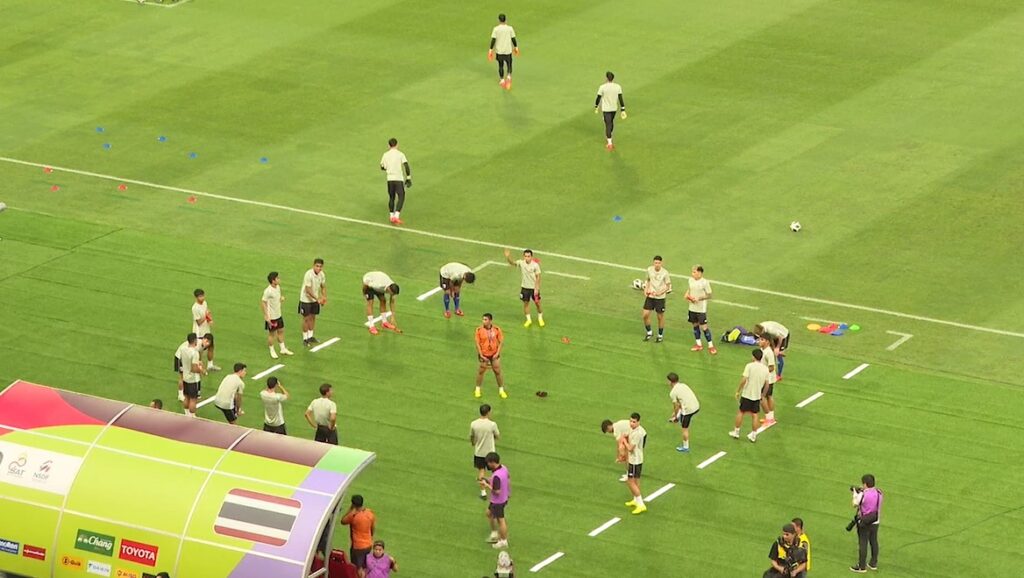 ขณะที่ มาซาทาดะ อิชิอิ กุนซือทีมชาติไทย นำนักเตะสักการะไหว้ขอพรสิ่งศักดิ์สิทธิ์ พระภูมิชัยมงคล และสักการะสิ่งศักดิ์สิทธิ์ประจำการกีฬาแห่งประเทศไทย บริเวณหอพระพุทธานุภาพพิชิตชัย เพื่อสร้างขวัญกำลังใจเป็นการเอาฤกษ์เอาชัย ก่อนจะพบกับสิงคโปร์ ก่อนที่ “อุ้ม” ธีราทร บุญมาทัน แบ็กซ้ายกัปตันทีม จะนำเพื่อนร่วมทีมอบอุ่นร่างกายในสนาม เช่นเดียวกับนักเตะสิงคโปร์ ก่อนจะลงสนามเวลา 19.30 น.