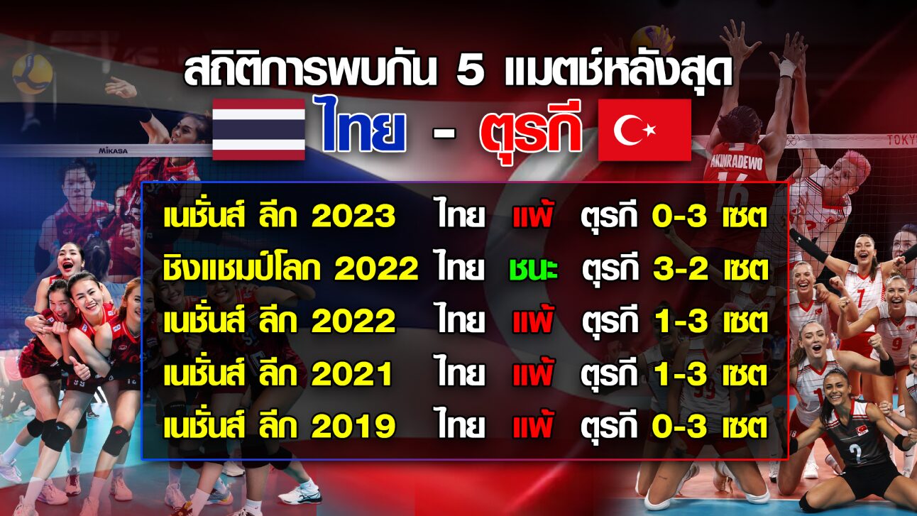 สถิติการพบกัน 5 แมตช์หลังสุด ไทย ชนะ 1 ตุรกี ชนะ 4 โดยศึกเนชันส์ ลีก 2023 ไทย แพ้ ตุรกี 0-3 เซต, ชิงแชมป์โลก 2022 ไทย ชนะ ตุรกี 3-2 เซต, เนชันส์ ลีก 2022 ไทย แพ้ ตุรกี 1-3 เซต, เนชันส์ ลีก 2021 ไทย แพ้ ตุรกี 1-3 เซต และเนชันส์ ลีก 2019 ไทย แพ้ ตุรกี 0-3 เซต สำหรับทีมสาวไทย จะลงสนามพบ ตุรกี ในช่วงเย็นวันนี้ เวลา 16.00 น. ที่ฮ่องกง .-สำนักข่าวไทย