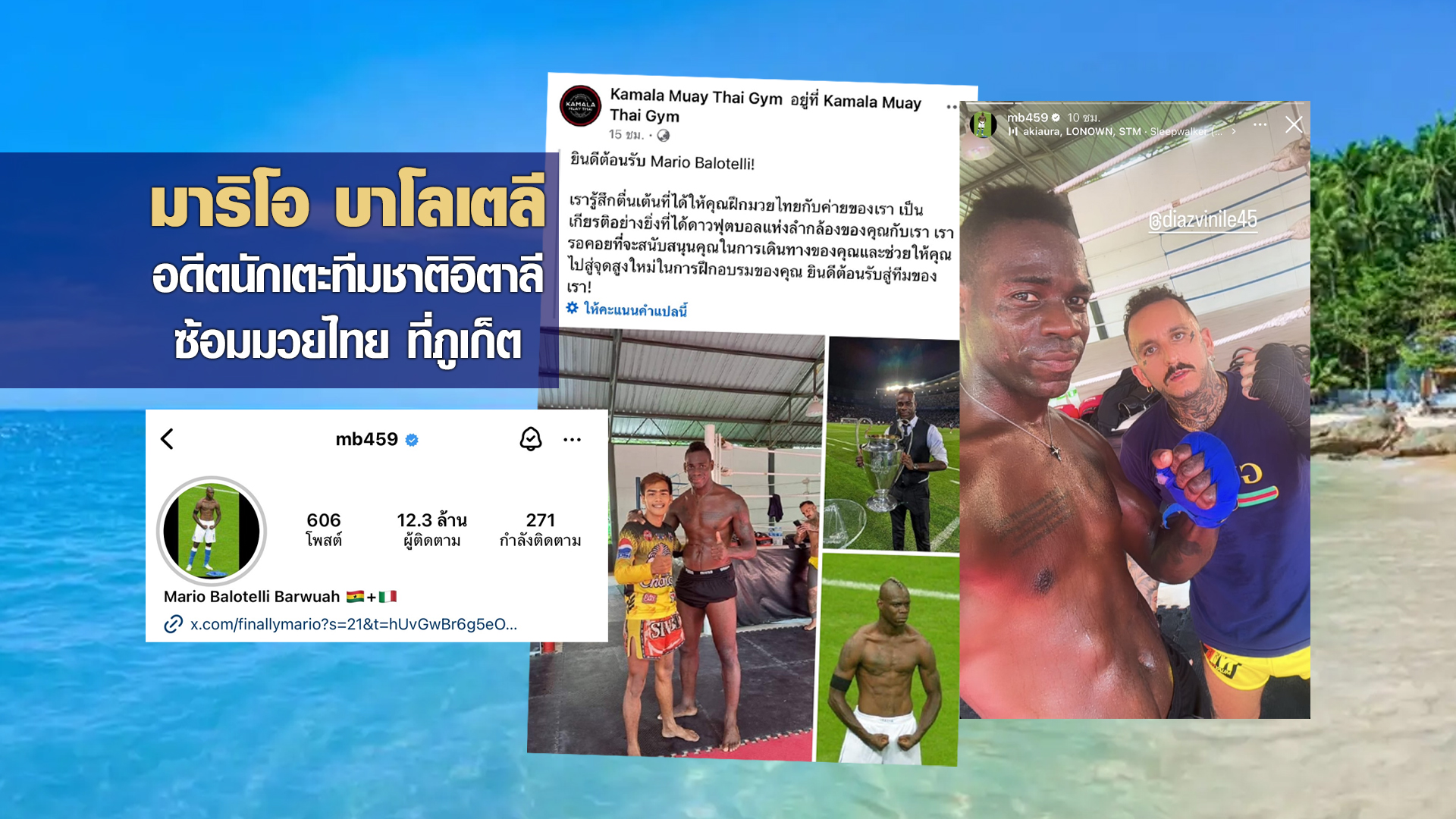“เกรียนโอ้” มาริโอ บาโลเตลี อดีตกองหน้าทีมชาติอิตาลีชุดรองแชมป์ฟุตบอลยูโร 2012 วัย 33 ปี และอดีตนักเตะของสโมสรดังอย่าง อินเตอร์ มิลาน, แมนเชสเตอร์ ซิตี้, ลิเวอร์พูล, เอเซี มิลาน และมาร์กเซย ปัจจุบันค้าแข้งสโมสรอดาน่า เดมิร์สปอร์ ในลีกตุรกี ได้ลงสตอรี่ไอจีส่วนตัว ที่มีคนติดตาม 12.3 ล้านคน มาพักผ่อนเมืองไทย หลังจากลีกปิดฤดูกาล และมีครูมวยแทกในไอจีของบาโลเตลี ลงเมื่อวานนี้ ได้มาเรียนรู้และฝึกซ้อม มวยไทย ที่ กมลา มวย ไทย ยิม จังหวัดภูเก็ต โดยมี “ครูบอย” อภินันท์ จันทร์ส่อง ได้ติวเข้ม