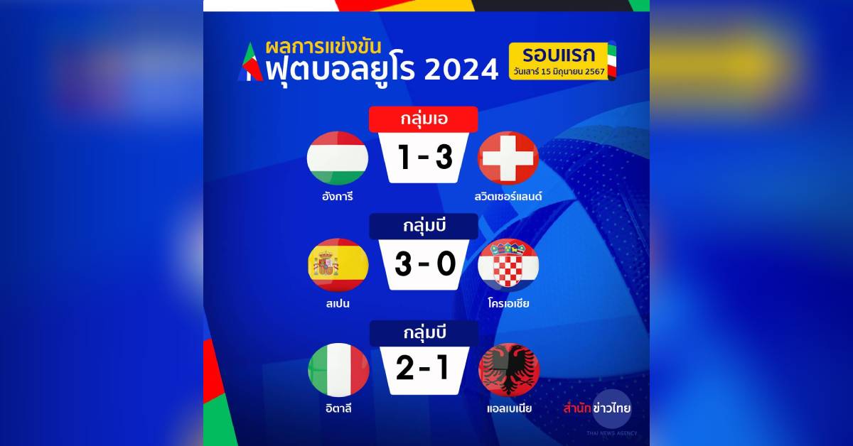 เยอรมนี 16 มิ.ย.-อิตาลี แชมป์เก่า เฉือนชนะ แอลแบเนีย 2-1 ส่วนสเปน อดีตแชมป์ยูโร 3 สมัย ถล่ม โครเอเชีย 3-0 ฟุตบอลยูโร 2024