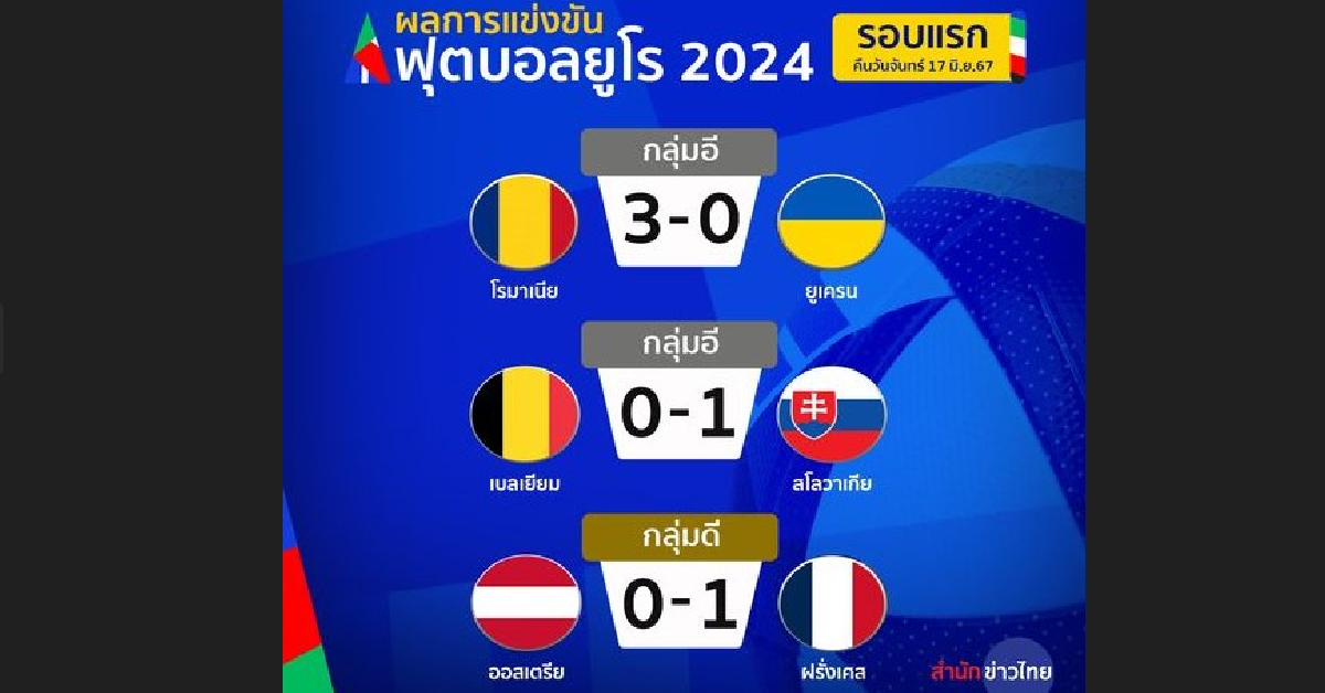 เยอรมนี 18 มิ.ย. – ฝรั่งเศส อีกหนึ่งทีมเต็งแชมป์ฟุตบอลยูโร 2024 เปิดหัวนัดแรกด้วยชัยชนะหืดจับเหนือทีมชาติออสเตรีย 1-0 ส่วนโรมาเนีย เอาชนะ ยูเครน สวยงาม 3-0 เป็นชัยชนะในฟุตบอลยูโรรอบสุดท้ายครั้งแรกในรอบ 24 ปี ขณะที่สโลวาเกีย พลิกชนะ เบลเยียม 1-0 เก็บ 3 คะแนนได้สำเร็จ