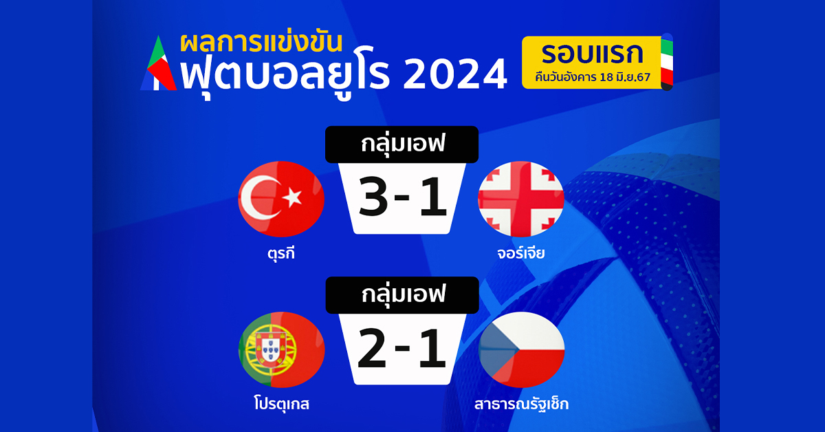 เยอรมนี 19 มิ.ย. – โปรตุเกสประเดิมฟุตบอลยูโร 2024 รอบสุดท้าย นัดแรก หืดจับกว่าจะเอาชนะสาธารณรัฐเช็ก 2-1 ส่วนอีกคู่ในกลุ่มเดียวกัน ตุรกี ชนะ จอร์เจีย แบบสุดมันส์ 3-1