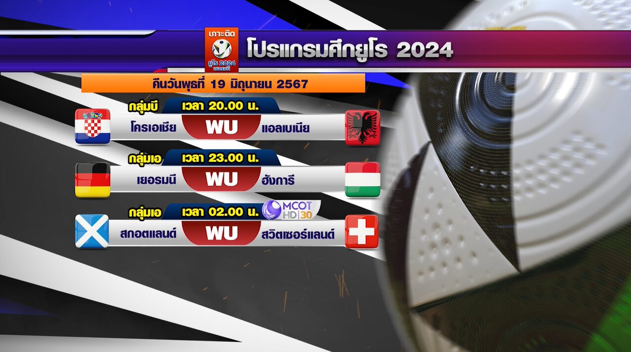 เยอรมนี 19 มิ.ย. – ศึกยูโร 2024 คืนนี้ มีเตะ 3 คู่ โดยช่อง 9 MCOT HD หมายเลข 30 จะถ่ายทอดสดเกมคู่ดึก ระหว่าง สกอตแลนด์ พบกับ สวิตเซอร์แลนด์ เวลา 02.00 น.