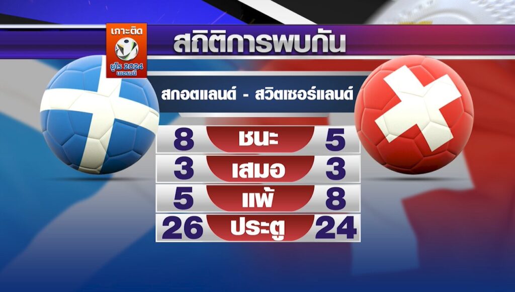สถิติการพบกันของทั้งคู่ เจอกันมา 16 นัด สกอตแลนด์ ชนะ 8 สวิตเซอร์แลนด์ ชนะ 5 เสมอ 3 นัด โดยสกอตแลนด์ ยิงได้ 26 ประตู และ สวิตเซอร์แลนด์ ยิงได้ 24 ประตู