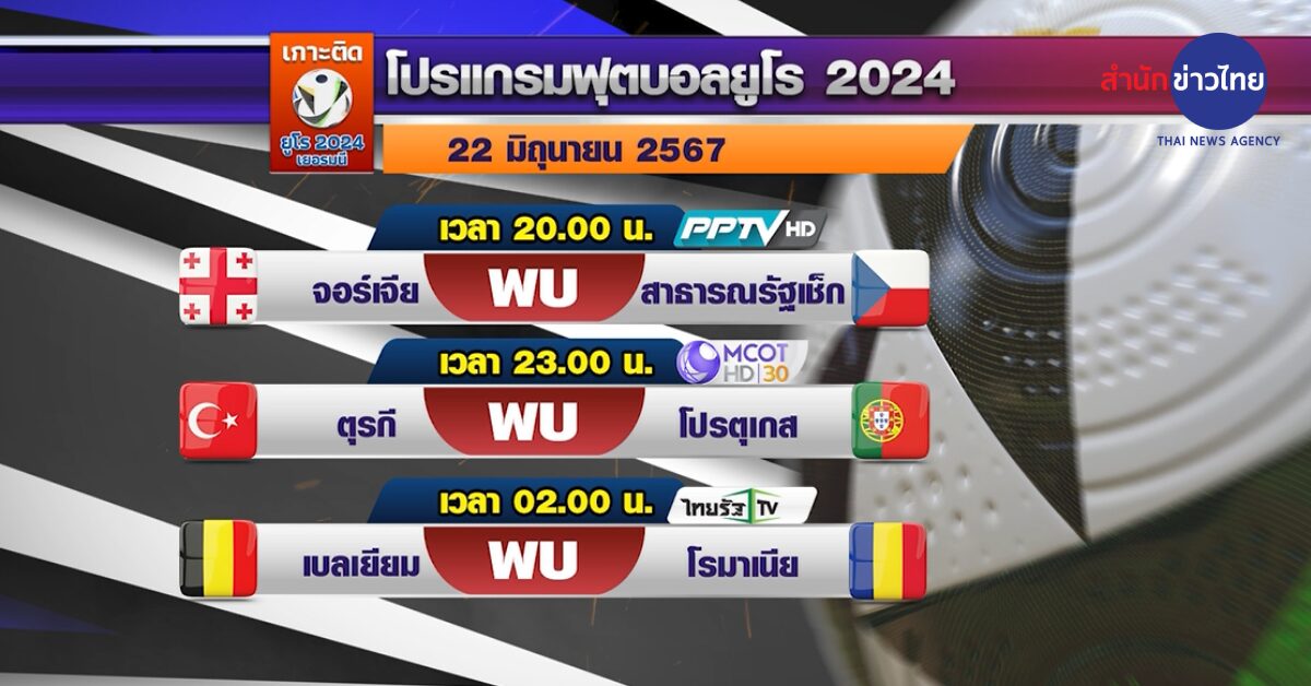 ศึกยูโร 2024 คืนนี้ มีเตะอีก 3 คู่ โดย ช่อง 9 MCOTHD หมายเลข 30 เตรียมถ่ายทอดสด เกมในรอบแรก นัดที่ 2 กลุ่มเอฟ ที่เบเฟาเบ สตาดิโอน ดอร์ทมุนด์ คู่ระหว่าง ตุรกี พบ โปรตุเกส เริ่มเข้ารายการตั้งแต่เวลา 22.30 น.