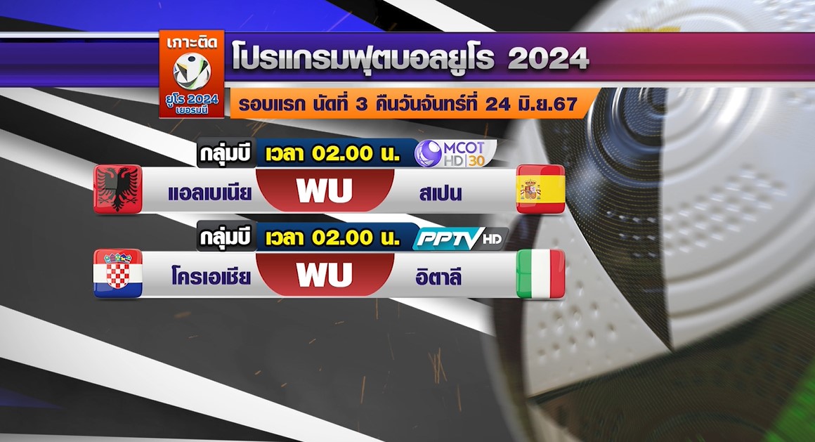 เยอรมนี 24 มิ.ย. – คืนนี้ (24 มิ.ย.) ช่อง 9 MCOT HD กด 30 เตรียมยิงสด แอลเบเนีย พบ สเปน แชมป์ยูโร 3 สมัย ส่วนอิตาลี แชมป์เก่า ขอ 1 แต้ม จากโครเอเชีย เพื่อการันตีเข้ารอบ