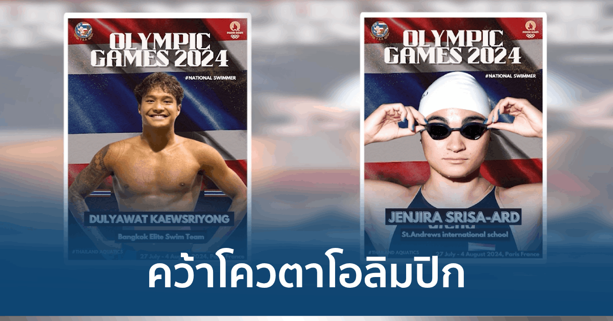 25 มิ.ย. – “เจนจิรา ศรีสอาด” และ “ดุลยวัต แก้วศรียงค์” 2 นักว่ายน้ำทีมชาติไทย ได้สิทธิแข่งขันโอลิมปิกเกมส์ 2024 รวมนักกีฬาไทย ได้ไปปารีสเกมส์แล้ว 47 คน