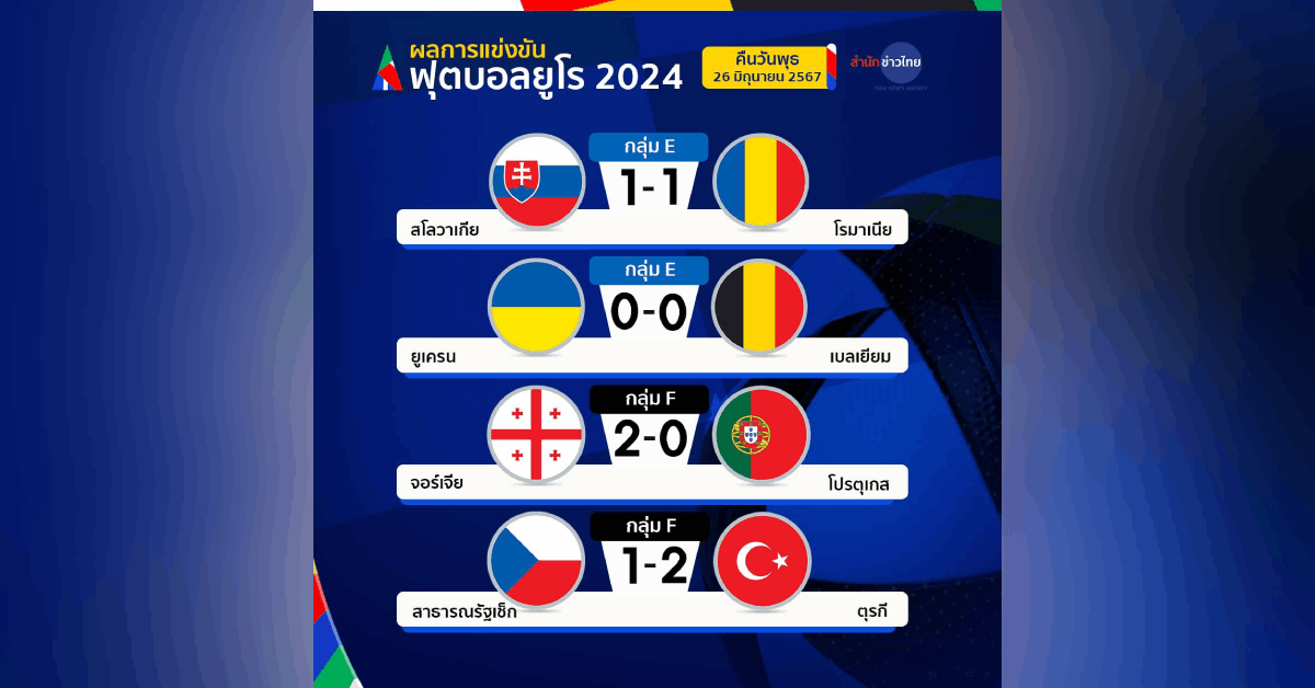 ฟุตบอลยูโร 2024 รอบสุดท้ายเมื่อคืนนี้ เป็นนัดสุดท้ายของรอบแบ่งกลุ่มในกลุ่ม อี และ เอฟ เริ่มที่กลุ่ม เอฟ ที่สนาม อารีนา อัลฟ์ ชาลเก ใน เกลเซนเคียร์เชน โปรตุเกส ที่มี 6 คะแนน พบ จอร์เจีย ที่มี 1 คะแนน ครึ่งแรก จอร์เจียออกนำไปก่อนอย่างรวดเร็ว ตั้งแต่นาทีที่ 2 จากลูกยิงของ ควิชา ควารัตสเคเลีย จากนั้นจอร์เจียขึงเกมรับเหนียวแน่นจนโปรตุเกสเจาะไม่เข้า จบครึ่งแรกจอร์เจียนำ 1-0 ครึ่งหลัง จอร์เจียมาได้ประตูนำห่าง 2-0 เมื่อ จอร์เจส มิเคาทัดเซ สังหารลูกจุดโทษเข้าไป เวลาที่เหลือโปรตุเกสยิงไม่ได้ จบเกม จอร์เจียพลิกล็อคชนะโปรตุเกส 2-0