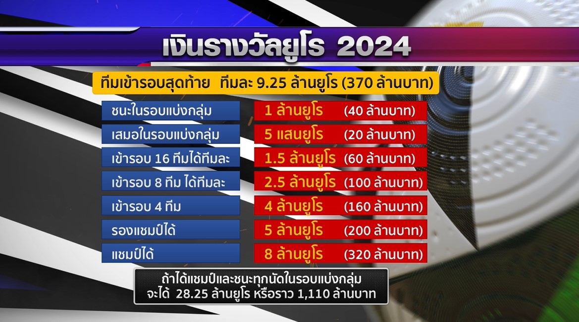 ส่วนอีกเรื่องที่น่าสนใจคือ เงินรางวัลสำหรับยูโรครั้งนี้ลดลงจากคราวก่อน ทีมเข้ารอบสุดท้ายจะได้ทีมละ 9.25 ล้านยูโร หรือราว 370 ล้านบาท, ชนะในรอบแบ่งกลุ่มได้ 1 ล้านยูโร หรือราว 40 ล้านบาท, เข้ารอบ 16 ทีม ได้ทีมละ 1.5 ล้านยูโร หรือราว 60 ล้านบาท, เข้ารอบ 8 ทีม ได้ทีมละ 2.5 ล้านยูโรหรือ 100 ล้านบาท, เข้ารอบ 4 ทีม ได้ 4 ล้านยูโร หรือ 160 ล้านบาท, รองแชมป์ได้ 5 ล้านยูโร หรือราว 200 ล้านบาท และแชมป์ได้ 8 ล้านยูโร หรือราว 320 ล้านบาท ซึ่งเงินแชมป์ลดลงจากยูโร 2020 ที่แชมป์ได้เพิ่มพิเศษ 10 ล้านยูโร แต่รวมแล้วยูโรครั้งนี้ ถ้าชาติใดได้แชมป์และชนะทุกนัดในรอบแบ่งกลุ่ม จะได้เงินสูงสุดที่ 28.25 ล้านยูโร หรือราว 1,110 ล้านบาท.-สำนักข่าวไทย