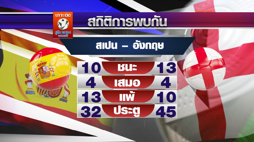 สำหรับสถิติของคู่นี้ เจอกันมา 27 ครั้ง สเปน ชนะ 10 ครั้ง อังกฤษ ชนะ 13 เสมอ 4 ครั้ง, สเปน ยิงได้ 32 ประตู อังกฤษ ยิงได้ 45 ประตู เกมล่าสุดที่พบกัน ในศึกเนชันส์ลีก วันที่ 16 ตุลาคม ปี 2018 ที่เซบียา ประเทศสเปน สเปน แพ้ อังกฤษ 2-3 .-สำนักข่าวไทย