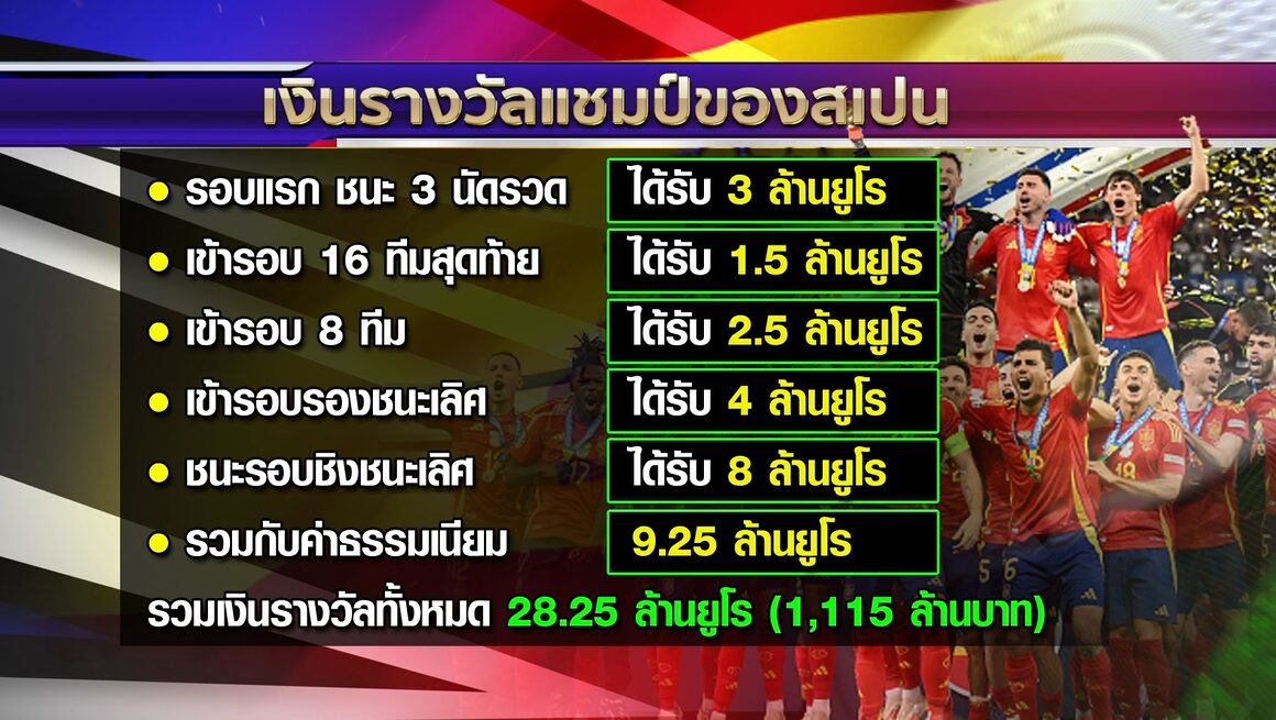 สำหรับการคว้าแชมป์ของสเปนในครั้งนี้ จะทำให้ทีมกระทิงดุ ได้รับเงินรางวัลรวมทั้งสิ้น 28.25 ล้านยูโร หรือประมาณ 1,115 ล้านบาท ด้วยผลงานเก็บชัยชนะครบ 7 นัดเป็นทีมแรก เข้าตามเงื่อนไขที่จะได้รับเงินรางวัลสูงที่สุดของทัวร์นาเมนต์