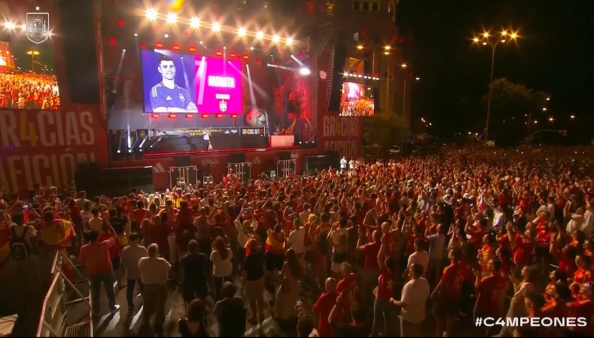 อัลบาโร โมราตา กัปตันทีม ชูถ้วยแชมป์ให้แฟนๆ กระทิงดุที่มารอต้อนรับได้ชื่นชม ก่อนลงจากเครื่องบิน พร้อมด้วย โรดรี, ลามีน ยามาล, นิโก วิลเลียมส์ และเพื่อนร่วมทีม