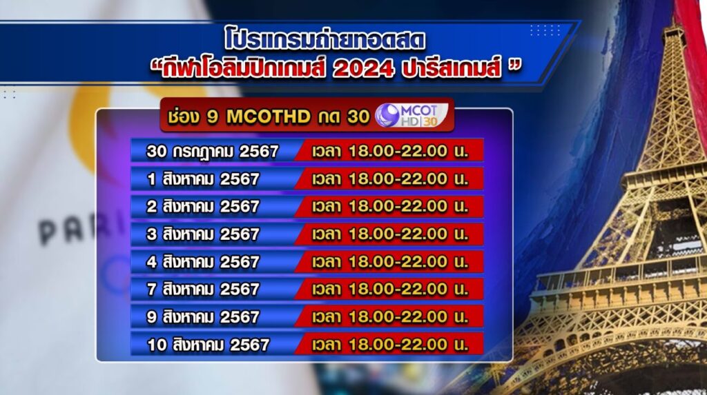 สำหรับแฟนกีฬาสามารถติดตามชมการถ่ายทอดสดกีฬาโอลิมปิกเกมส์ 2024 ปารีสเกมส์ ได้ทางช่อง 9 MCOTHD กด 30 ทั้งหมด 8 วัน วันละ 4 ชั่วโมง เวลา 18.00-22.00 น. ในวันที่ 30 กรกฎาคม, 1-4 สิงหาคม, 7 สิงหาคม และวันที่ 9-10 สิงหาคม