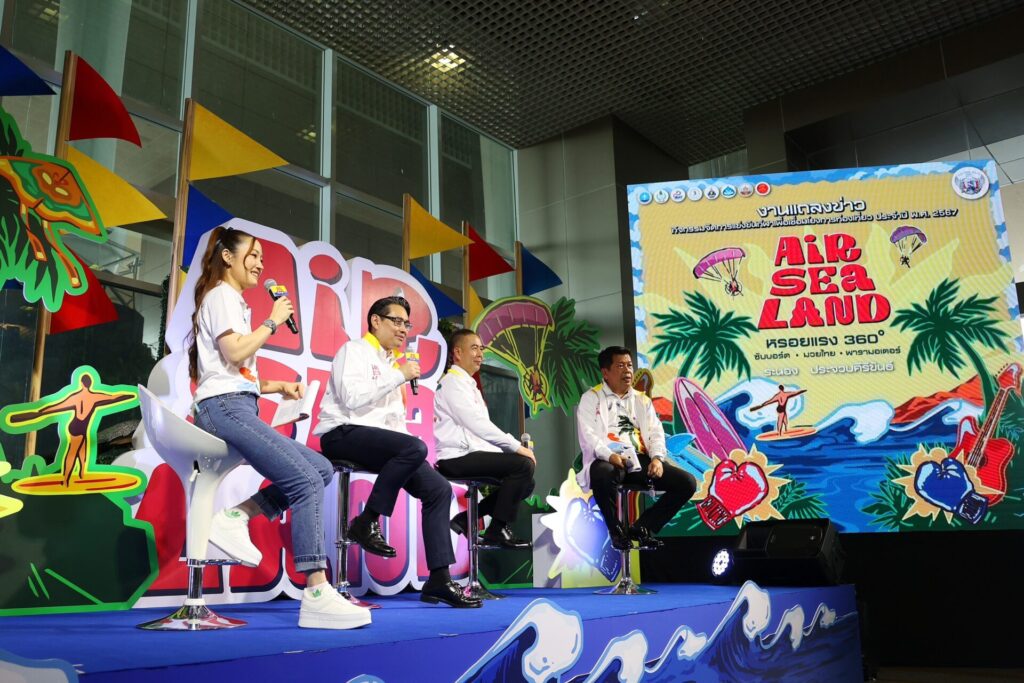 ดร.ก้องศักด ยอดมณี ผู้ว่าการการกีฬาแห่งประเทศไทย พร้อมด้วยนางโปรดปราน สมานมิตร รองผู้ว่าการ ฝ่ายส่งเสริมกีฬา การกีฬาแห่งประเทศไทย นายราชัน มีน้อย รองผู้ว่าราชการจังหวัดระนอง และนายคมกริช เจริญพัฒนสมบัติ รองผู้ว่าราชการจังหวัดประจวบคีรีขันธ์ ร่วมแถลงข่าวการจัดกิจกรรมจัดการแข่งขันกีฬาเพื่อเชื่อมโยงการท่องเที่ยว “AIR SEA LAND หรอยแรง 360 องศา” ภายใต้โครงการ Air Sea Land Southern International Sports Tourism Festival 2024 ในพื้นที่จังหวัดระนองและจังหวัดประจวบคีรีขันธ์ ประจำปีงบประมาณ พ.ศ. ๒๕๖๗ ที่บริเวณโถง ชั้น ๑ อาคารเฉลิมพระเกียรติ ๗ รอบ พระชนมพรรษา การกีฬาแห่งประเทศไทย เมื่อวันที่ 19 กรกฎาคม