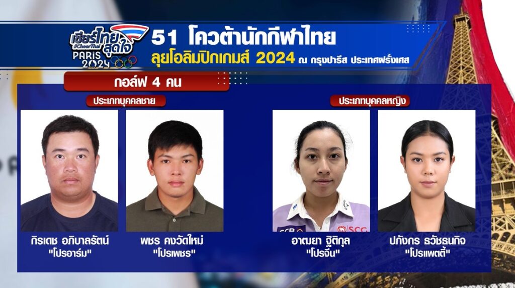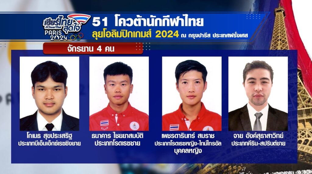 เหลืออีก 4 วัน มหกรรมกีฬาโอลิมปิกเกมส์ 2024 ที่กรุงปารีส ประเทศฝรั่งเศส จะเริ่มขึ้นคืนวันศุกร์ที่ 26 กรกฎาคม ซึ่งครั้งนี้ทัพนักกีฬาไทยได้โควตา 51 คน จาก 17 ชนิดกีฬา 16 สมาคม ที่ให้คนไทยได้ร่วมเชียร์ไทยสุดใจโอลิมปิก ปารีสเกมส์ 2024 ในครั้งนี้