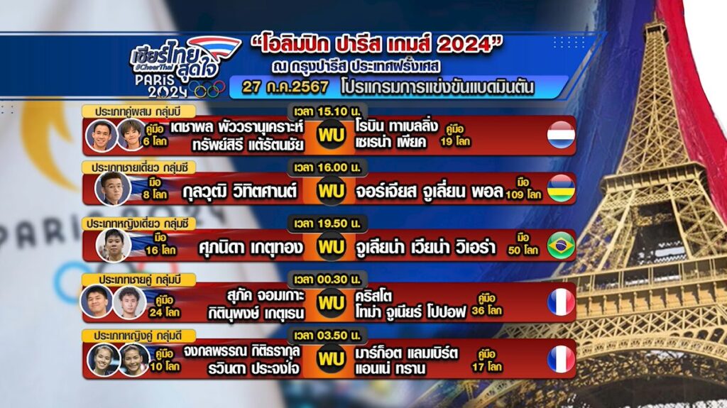 ส่วนโปรแกรมการแข่งขันของนักกีฬาทีมชาติไทย ที่น่าสนใจวันนี้ แบดมินตัน