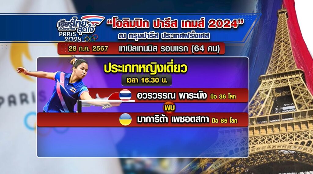 เทเบิลเทนนิส รอบแรก (64 คน) ประเภทหญิงเดี่ยว 16.30 น. อรวรรณ พาระนัง (มือ 36 โลก/ไทย) พบ มาการิต้า เพซอตสกา (มือ 85 โลก/ยูเครน)