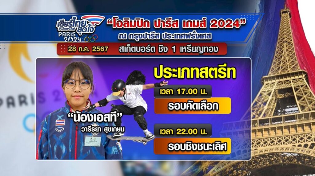 สเก็ตบอร์ด ชิง 1 เหรียญทอง ประเภทสตรีท เวลา 17.00 น. รอบคัดเลือก “น้องเอสที” วารีรยา สุขเกษม เวลา 22.00 น. รอบชิงชนะเลิศ