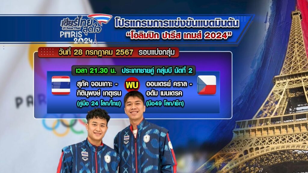 ชายคู่ กลุ่มบี. นัดที่ 2 เวลา 21.30 น. สุภัค จอมเกาะ กับ กิตินุพงษ์ เกตุเรน (มือ 24 โลก/ไทย) พบ ออนเดรย์ คราล กับ อดัม เมนเดรค (มือ49 โลก/เช็ก)