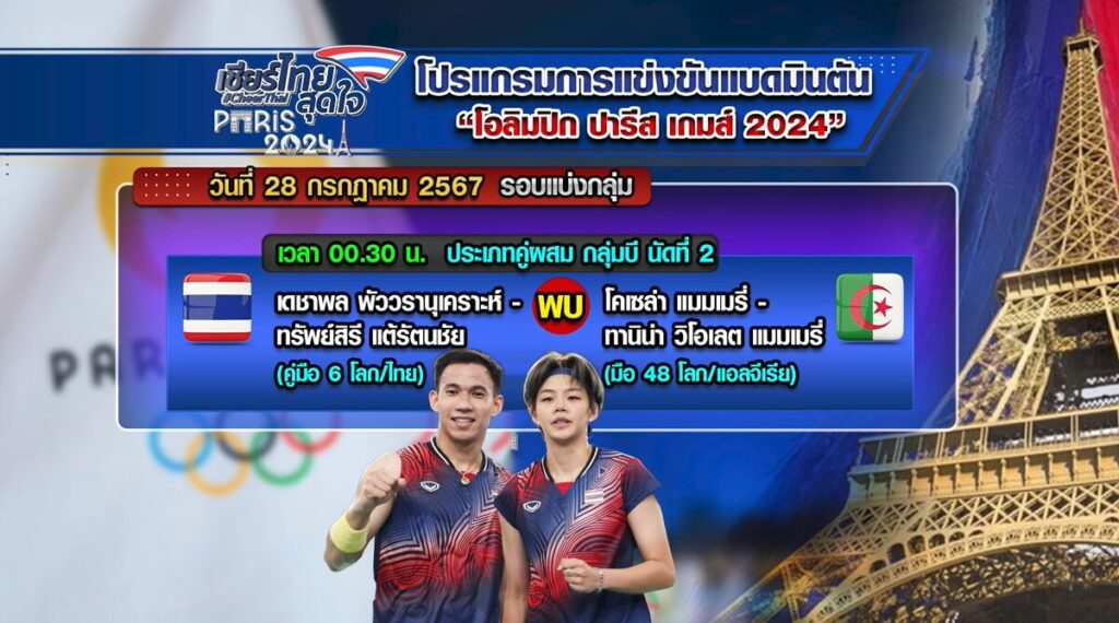 คู่ผสม กลุ่มบี นัดที่ 2 เวลา 00.30 น. เดชาพล พัววรานุเคราะห์ กับ ทรัพย์สิรี แต้รัตนชัย (มือ 6 โลก/ไทย) พบ โคเซล่า แมมเมรี่ กับ ทานิน่า วิโอเลต แมมเมรี่ แอลจีเรีย (มือ 48 โลก/แอลจีเรีย).-สำนักข่าวไทย