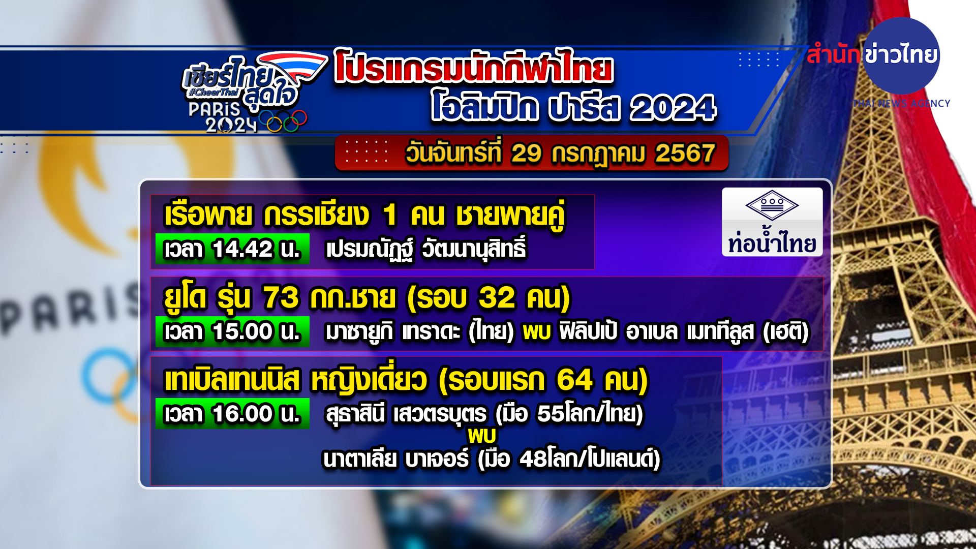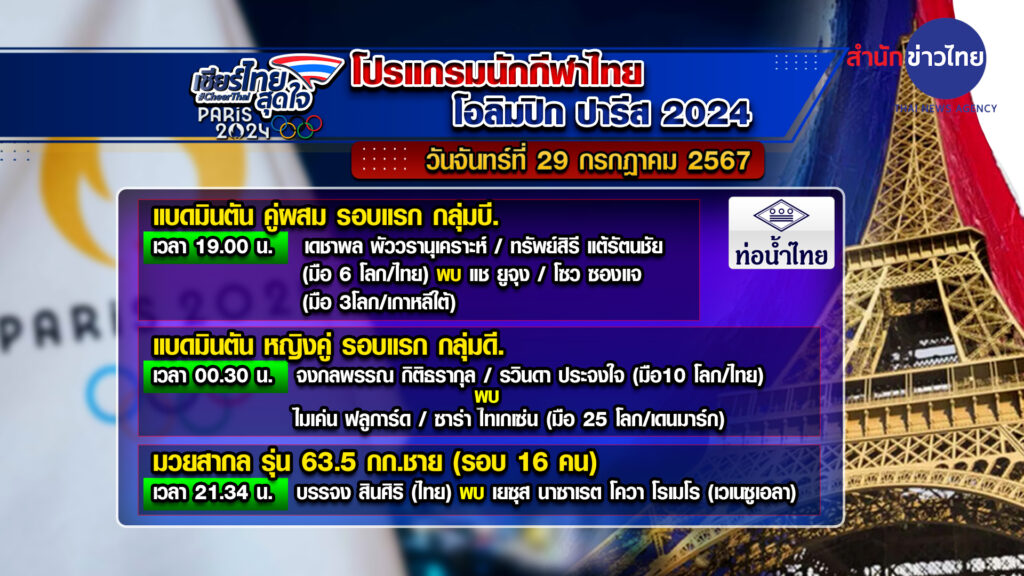 ฝรั่งเศส 29 ก.ค.- โปรแกรมการแข่งขันโอลิมปิก 2024 เช็กเวลานักกีฬาไทยลงแข่งขัน ประจำวันที่ 29 กรกฎาคม 2567