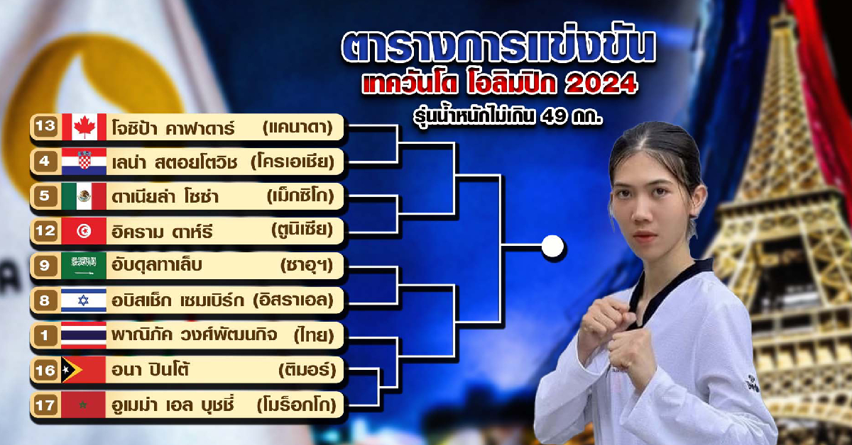 ฝรั่งเศส 6 ส.ค. – เปิดสายแข่งขันรอบแรกอย่างเป็นทางการ “เทนนิส” พาณิภัค วงศ์พัฒนกิจ ลุ้นป้องกันแชมป์เทควันโด รอพบคู่แข่งจากติมอร์-เลสเต หรือโมร็อกโก ชนะ 4 แมตช์ ได้เหรียญทอง