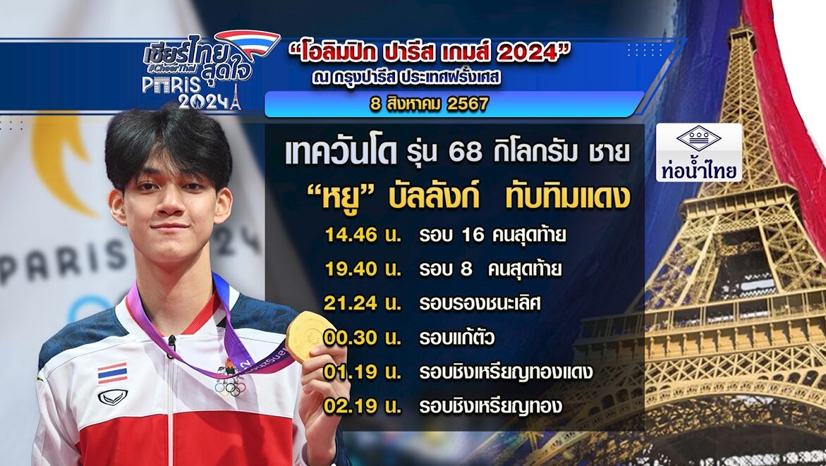 เทควันโด โอลิมปิกเกมส์ 2024 วันที่ 2 ที่สนาม เลอ กร็องด์ ปาเลส์ กรุงปารีส รุ่นน้ำหนักไม่เกิน 68 กิโลกรัมชาย บ่ายวันนี้ เวลา 14.46 น. “หยู” บัลลังก์ ทับทิมแดง จอมเตะดาวรุ่งหนุ่มไทยวัย 19 ปี จากจังหวัดประจวบคีรีขันธ์ มือ 12 ของรายการ จะลงเตะรอบ 16 คนสุดท้าย พบกับ ฆาเบียร์ เปเรซ โปโล มือ 5 ของรายการจากสเปน และหากชนะได้ จะเข้ารอบก่อนรองชนะเลิศ เวลา 19.40 น. รอบรองชนะเลิศ เวลา 21.24 น. และรอบชิงชนะเลิศ เวลา 02.19 น.