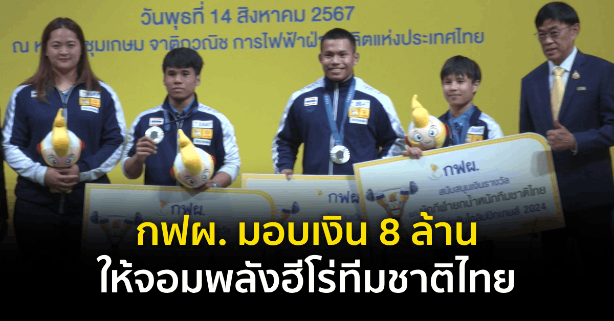 14 ส.ค. – กฟผ. มอบเงินสนับสนุน ฮีโร่จอมพลังหนุ่มสาวไทย ในปารีสเกมส์ 2024 จำนวน 8 ล้านบาท ส่วน “เจ้าก็อต” จอมพลังหนุ่มทีมชาติไทย ขยับขึ้นไปการันตีคว้าเหรียญเงิน ริโอเกมส์ 2016 เป็นอย่างน้อย รอลุ้นศาลกีฬาโลกตัดสินคำอุทธรณ์ของนักกีฬาจีน เพื่อคว้าเหรียญทองอย่างเป็นทางการ