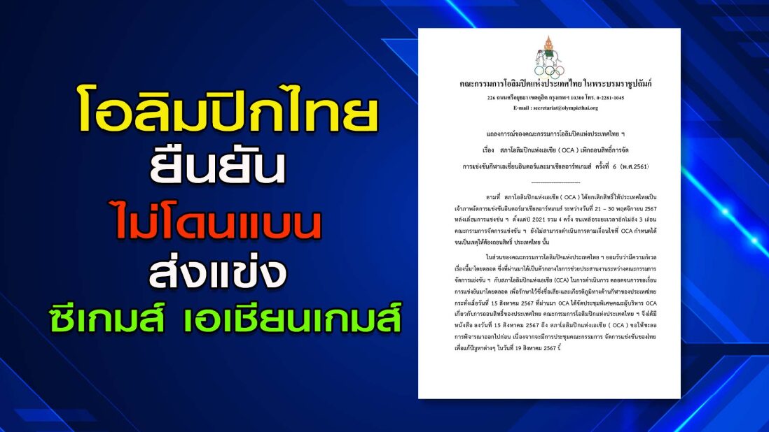 21 ส.ค. – โอลิมปิกไทย ยืนยัน โอซีเอ ไม่แบนไทยส่งแข่งขันเอเชียนเกมส์ 2026 และซีเกมส์ 2025 หลังจากถอนสิทธิไม่ให้ไทยเป็นเจ้าภาพกีฬาเอเชียนอินดอร์ และมาเชียลอาร์ตเกมส์