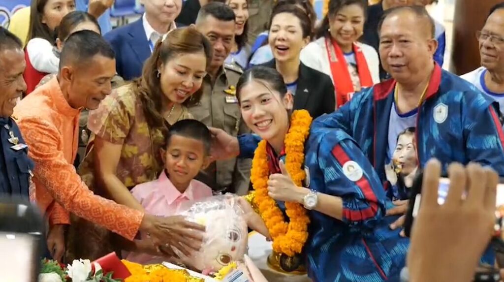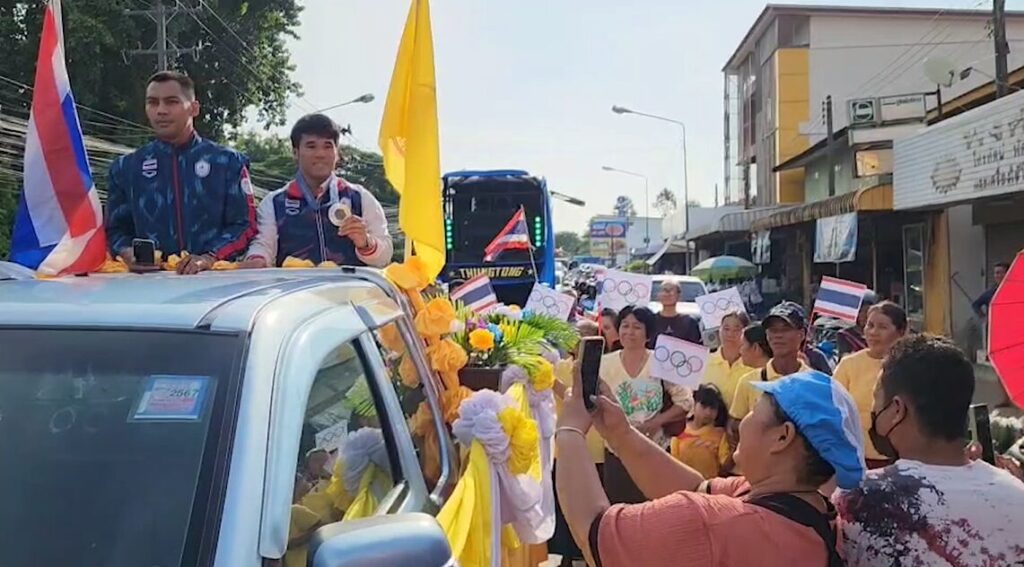 ด้านบรรยากาศที่จังหวัดศรีสะเกษ “ฟ่าง” ธีรพงศ์ ศิลาชัย นักกีฬายกน้ำหนักทีมชาติไทย เจ้าของเหรียญเงินโอลิมปิกเกมส์ 2024 เดินกลับถึงบ้านเกิดแล้วเช่นกัน มีนายสุขกิจ เหลืองสกุลไทย นายอำเภอขุนหาญ พร้อม นายนำชัย ปิติขุนหาญ นายกเทศมนตรีตำบลกระหวัน ได้จัดขบวนแห่เชิดชูเกียรติ ซึ่งในขบวนมี บรรจง สินศิริ นักกีฬามวยสากลทีมชาติไทยชุด “ปารีสเกมส์” ที่เป็นคนขุนหาญ และร่วมขบวนด้วย โดยบรรยากาศเป็นไปด้วยความอบอุ่น เป็นกันเอง และมีชาวอำเภอขุนหาญต่างออกมาต้อนรับ ขอถ่ายรูป