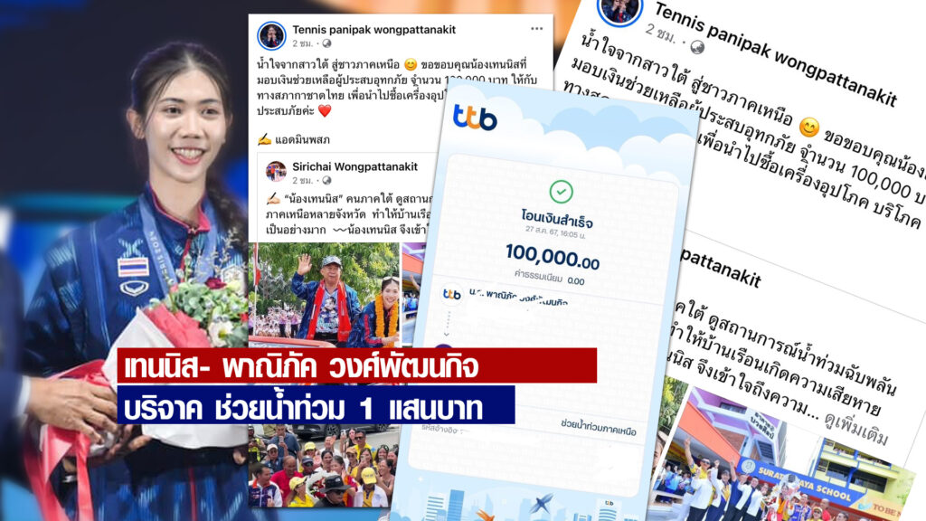 ขณะเดียวกัน “เทนนิส” พาณิภัค วงศ์พัฒนกิจ ฮีโร่เหรียญทองเทควันโดโอลิมปิกเกมส์ 2 สมัย ได้แชร์โพสต์เฟซบุ๊กของคุณพ่อสิริชัย ในเพจ Tennis panipak wongpattanakit ข้อความว่า “น้ำใจจากสาวใต้ สู่ชาวภาคเหนือ ขอขอบคุณน้องเทนนิสที่มอบเงินช่วยเหลือผู้ประสบอุทกภัย จำนวน 100,000 บาท ให้กับทางสภากาชาดไทย เพื่อนำไปซื้อเครื่ิองอุปโภคบริโภคให้กับผู้ประสบภัยค่ะ” “เทนนิส เข้าใจถึงความยากลำบากของผู้ประสบภัยในภาคเหนือครั้งนี้เป็นอย่างมาก จึงขอบริจาคเงินมูลค่า 100,000 บาท เพื่อให้ทางสภากาชาดไทย ได้นำได้ซื้อเครื่องใช้ อุปโภคบริโภค อาหาร สำหรับผู้ประสบภัย และหวังเป็นอย่างยิ่งว่าสถานการณ์น้ำท่วมนี้จะคลี่คลายและกลับคืนสู่ภาวะปกติโดยเร็ว คนไทยเราไม่ทิ้งกัน”