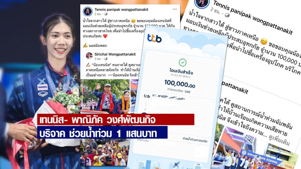 28 ส.ค. – “น้องเทนนิส” พาณิภัค วงศ์พัฒนกิจ ร่วมบริจาคน้ำท่วมภาคเหนือ 1 แสนบาท ให้กับสภากาชาดไทย พร้อมเปิดประมูลเสื้อและตุ๊กตามาสคอตเพิ่ม
