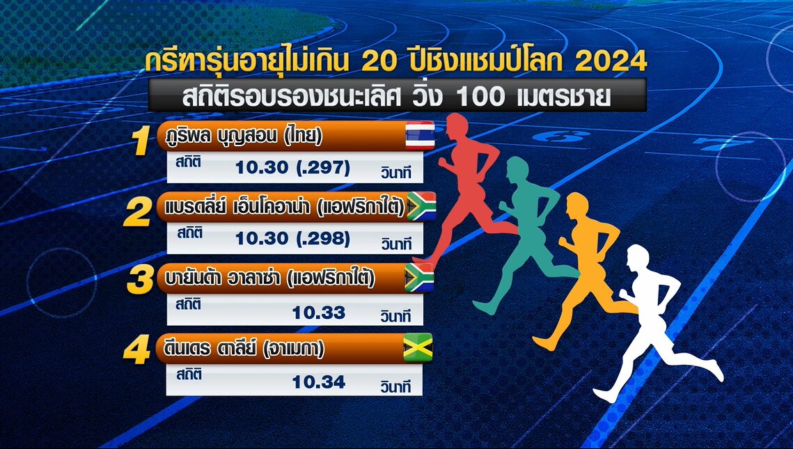 กลับมาอีกครั้งในศึก กรีฑาเยาวชนอายุไม่เกิน 20 ปีชิงแชมป์โลก หรือ เวิลด์แอธเลติกส์ยู-20 แชมเปียนชิพ 2024 ที่เอสตาดิโอ แอตเลติโก เดลาวิเดนา กรุงลิมา ประเทศเปรู และลงแข่งขันรายการแรกคือ วิ่ง 100 เมตรชาย รอบรองชนะเลิศ “บิว” ภูริพล บุญสอน ในเสื้อสีน้ำเงินลู่ที่ 5 สปีดเข้าเส้นชัยเป็นคนแรกในฮีตที่ 2 สถิติ 10.30 วินาที โดยเฉือน แบรดลีย์ เอ็นโคอานา จากแอฟริกาใต้ ที่เพิ่งคว้าเหรียญเงินโอลิมปิก 2024 ในวิ่งผลัด 4X100 เมตรชายด้วยภาพถ่าย หลังเข้าเส้นชัยด้วยสถิติ 10.30 วินาทีเหมือนกัน โดยลมกรดดาวรุ่งไทยเฉือนเอาชนะ เอ็นโคอานา ไปเพียง 0.001 วินาที