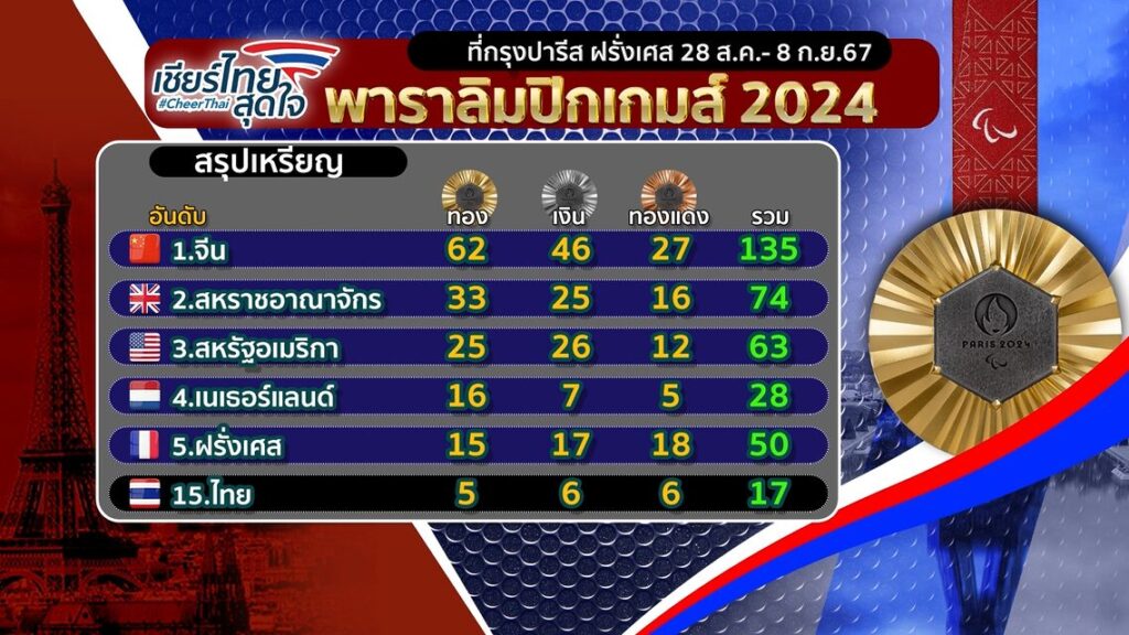 สรุปเหรียญทอง ทัพพาราไทย คว้าไปแล้ว 5 เหรียญทอง 6 เหรียญเงิน และ 6 เหรียญทองแดง อยู่อันดับ 15 ของตารางเหรียญ โดยอันดับ 1 เป็นจีน คว้า 62 เหรียญทอง 46 เหรียญเงิน 27 เหรียญทองแดง อันดับ 2.สหราชอาณาจักร 33 เหรียญทอง อันดับ 3 สหรัฐอเมริกา 25 เหรียญทอง .-สำนักข่าวไทย
