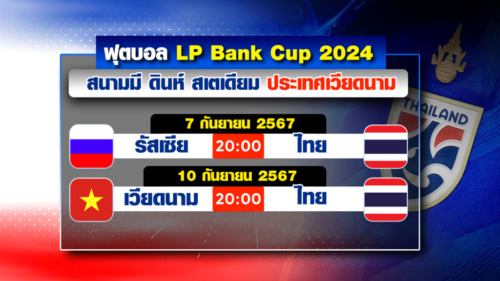 สำหรับโปรแกรมฟุตบอล “LP Bank Cup 2024” ของทีมชาติไทย นัดแรก วันเสาร์ที่ 7 กันยายน พบรัสเซีย และนัดที่ 2 วันอังคารที่ 10 กันยายน พบเวียดนาม โดยจะเตะเวลา 20.00 น. ทั้ง 2 เกม ที่สนามมี ดินห์ สเตเดียม .-สำนักข่าวไทย