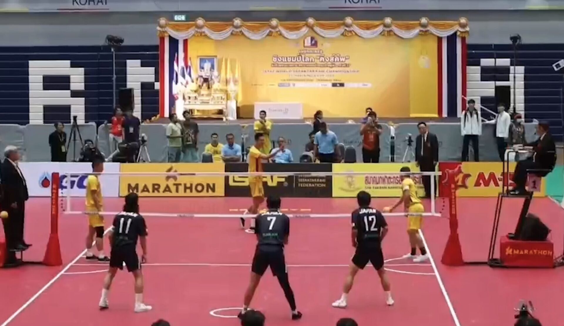 ตะกร้อชิงแชมป์โลก 2024 ชิงถ้วยพระราชทานคิงส์คัพ ครั้งที่ 37 ที่ศูนย์การค้าเทอร์มินอล 21 จังหวัดนครราชสีมา ทีมชาย รอบแบ่งกลุ่ม พรีเมียร์ดิวิชั่น กลุ่มเอ. ทีมตะกร้อหนุ่มไทย แชมป์ 35 สมัย ชุดสีเหลือง พบกับ ญี่ปุ่น ทีมเอ ไทยส่ง สิทธิพงศ์ คำจันทร์, สุพศิน บุญเรือง และ วรายุทธ์ จันทรเสนา เซตแรกทีมไทยเฉือนชนะไปอย่างสนุก 17-14 คะแนน เซตที่สองทีมไทยชนะ 15-8 ทำให้ทีมเอ.ไทยชนะ 2-0 เซต ขึ้นนำ 1-0 ทีม หลังจากนั้นทีมบี และทีมซี ไทยเก็บชัยชนะได้ทั้งคู่ ส่งผลให้ไทยเอาชนะไป 3-0 ทีม คว้าชัย 2 นัดรวดเป็นแชมป์กลุ่มเอ ผ่านเข้ารอบรองชนะเลิศไปรอพบกับแชมป์กลุ่มบี.ในช่วงบ่ายวันนี้ .-สำนักข่าวไทย