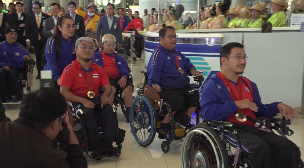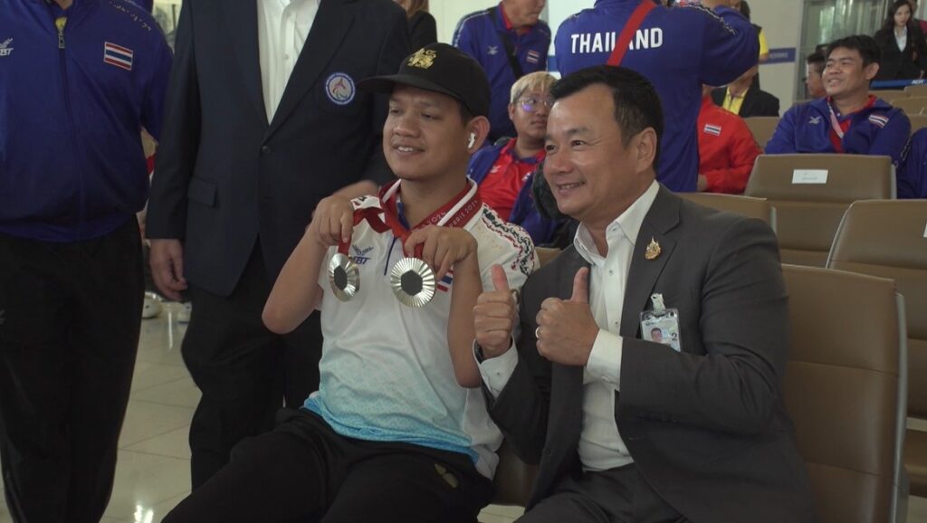 สนามบินสุวรรณภูมิ 10 ก.ย. – “เจมส์” วรวุฒิ แสงอำภา เหรียญทองบอคเซียบุคคล นำทัพพาราลิมปิกชุดแรกเดินทางกลับถึงไทย โดยมี รมว.ท่องเที่ยวและกีฬา คนใหม่ให้การต้อนรับ