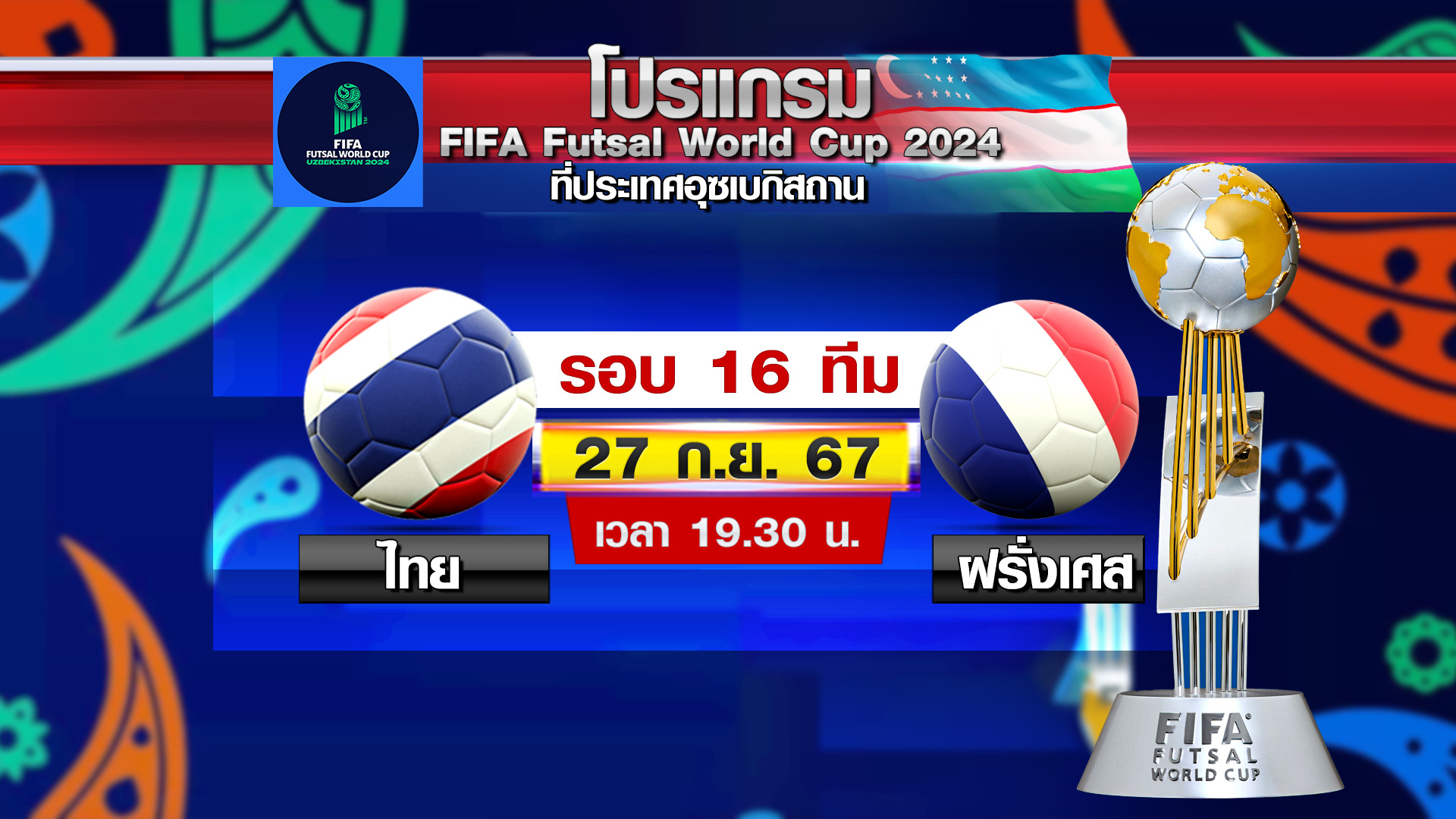 โปรแกรมฟุตซอลโลก 2024 ที่ประเทศอุซเบกิสถาน รอบ 16 ทีม วันที่ 27 ก.ย. เวลา 19.30 น. ไทย พบ ฝรั่งเศส .-สำนักข่าวไทย