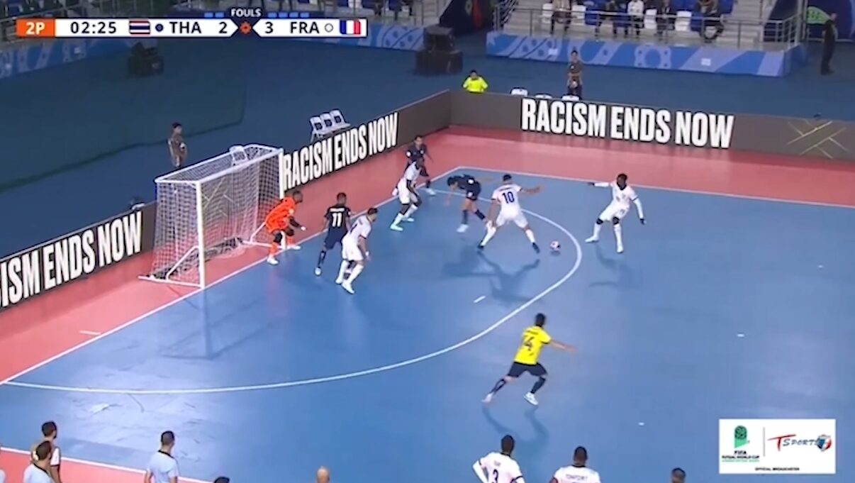 ฟุตซอลโลก 2024 รอบ 16 ทีมสุดท้าย เมื่อวานนี้ที่สนาม บูคารา ยูนิเวอร์เซล สปอร์ต คอมเพล็กซ์ ประเทศอุซเบกิสถาน ทีมชาติไทยในชุดสีน้ำเงิน 9 ของโลก ลงสนามพบกับ ฝรั่งเศส อันดับ 10 ของโลก ซึ่งรอบที่ผ่านมา ทีมฝรั่งเศส มี ดราม่ากรณีเล่นแบบไม่เต็มที่ในนัดเจออิหร่าน เพื่อหวังมาเจอไทย ปรากฏว่า คู่นี้ต้นเกมสูสี ก่อนที่นาทีที่ 8 ฝรั่งเศส มาได้ประตูขึ้นนำก่อน 1-0 ในครึ่งแรก จาก สตีฟ เบนดาลี่ ได้ซัดด้วยซ้ายเข้าประตูไป