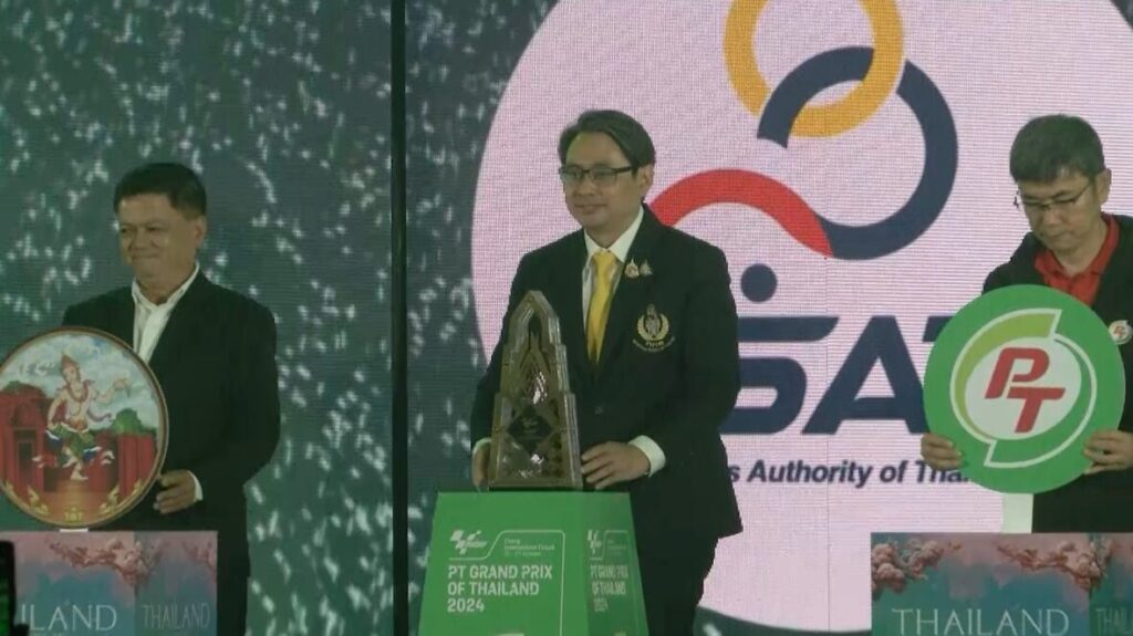ดร.ก้องศักด ยอดมณี ผู้ว่าการการกีฬาแห่งประเทศไทย เป็นประธานในงานนับถอยหลังการแข่งขันรถจักรยานยนต์ทางเรียบชิงแชมป์โลก หรือ โมโตจีพี ที่ประเทศไทยเป็นเจ้าภาพ ภายใต้ชื่อรายการ “PT Grand Prix of Thailand 2024” ในระหว่าง 25- 27 ตุลาคม ที่ สนามช้าง อินเตอร์เนชั่นแนล เซอร์กิต จ.บุรีรัมย์ โดยเคาน์ดาวน์เหลืออีก 24 วัน พร้อมกันนี้ยังได้เปิดตัว “ถ้วยรางวัลหรือโทรฟี่” ThaiGP ประจำปี 2024 ด้วยธีม “บัลลังก์เจ้าแห่งความเร็ว” ลักษณะไทยโมเดิร์น ผสานความงดงาม “ปราสาทหินพนมรุ้ง” ส่วนกลางถ้วยมีสัญลักษณ์การพนมไหว้ ส่วนวัสดุของตัวถ้วยมีการดัดแปลงนำ “ชิ้นส่วนรถมอเตอร์ไซค์” มาเป็นส่วนหนึ่งของถ้วยรางวัลด้วย