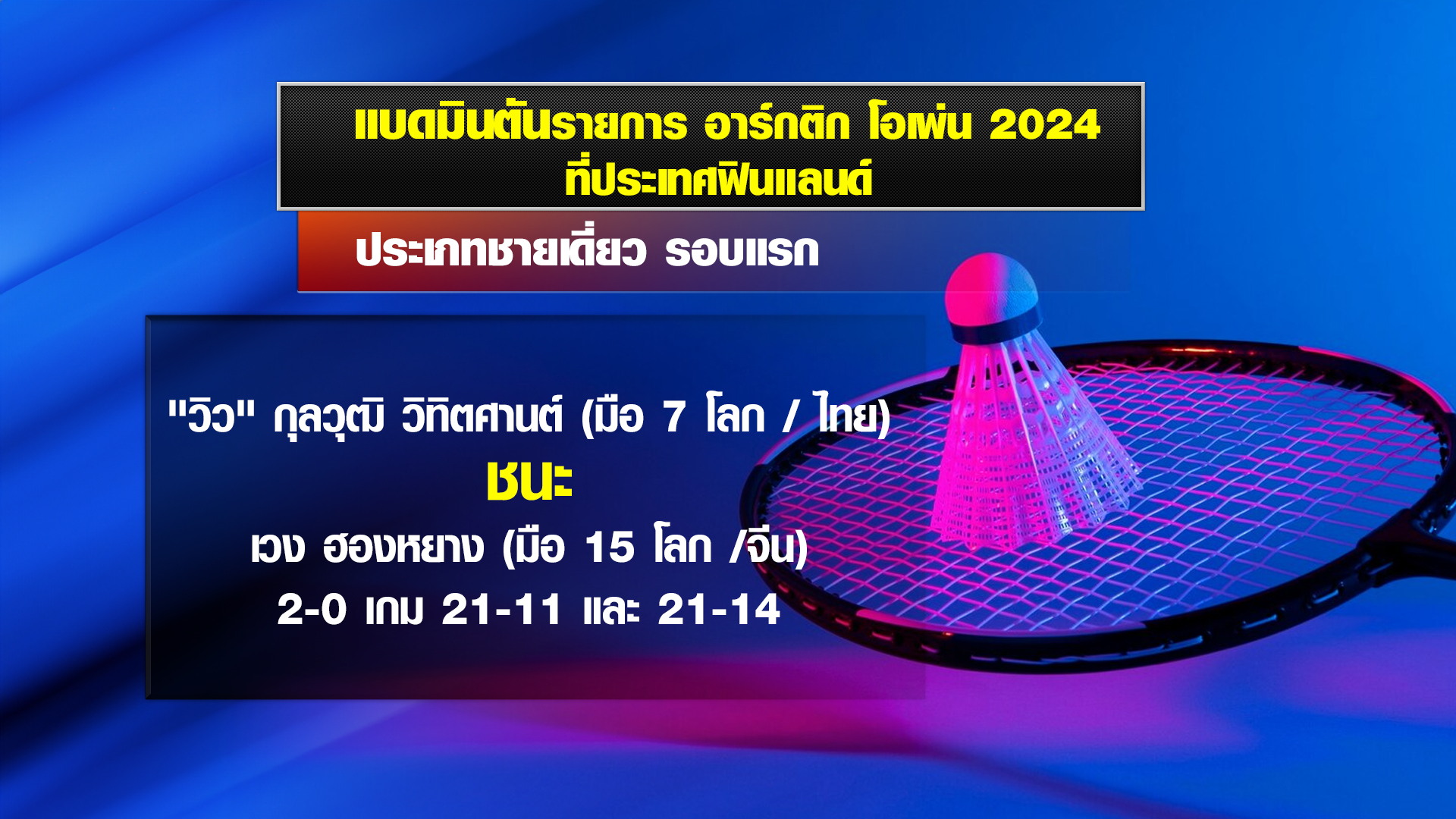 แบดมินตันรายการอาร์กติก โอเพ่น 2024 รายการระดับเวิลด์ทัวร์ ซูเปอร์ 500 ที่ประเทศฟินแลนด์ ประเภทชายเดี่ยว รอบแรก “วิว” กุลวุฒิ วิทิตศานต์ มือ 8 ของรายการ และมือ 7 ของโลก ตบเอาชนะ เวง ฮองหยาง มือ 15 ของโลก จากจีน เจ้าของแชมป์ไชน่า โอเพ่น 2 เกมรวด 21-11 และ 21-14 ผ่านเข้ารอบ 2 ไปพบกับ อึ้ง กาลอง อังกุส มือ 20 ของโลก จากฮ่องกง