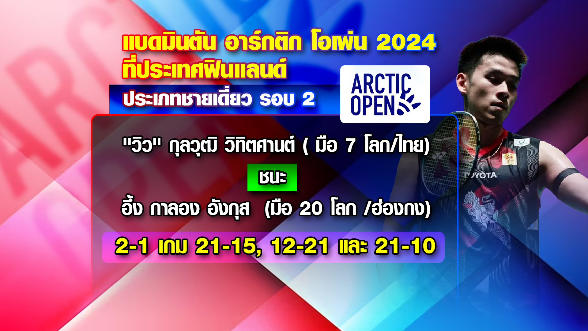 แบดมินตันรายการอาร์กติก โอเพ่น 2024 รายการระดับเวิลด์ทัวร์ ซูเปอร์ 500 ที่ประเทศฟินแลนด์ ประเภทชายเดี่ยว รอบ 2 “วิว” กุลวุฒิ วิทิตศานต์ มือ 7 ของโลก ตบเอาชนะ อึ้ง กาลอง อังกุส มือ 20 ของโลก จากฮ่องกง 2-1 เกม 21-15, 12-21 และ 21-10 ผ่านเข้ารอบ 8 คนสุดท้าย พบ โคได นาราโอกะ มือ 6 ของโลก จากญี่ปุ่น