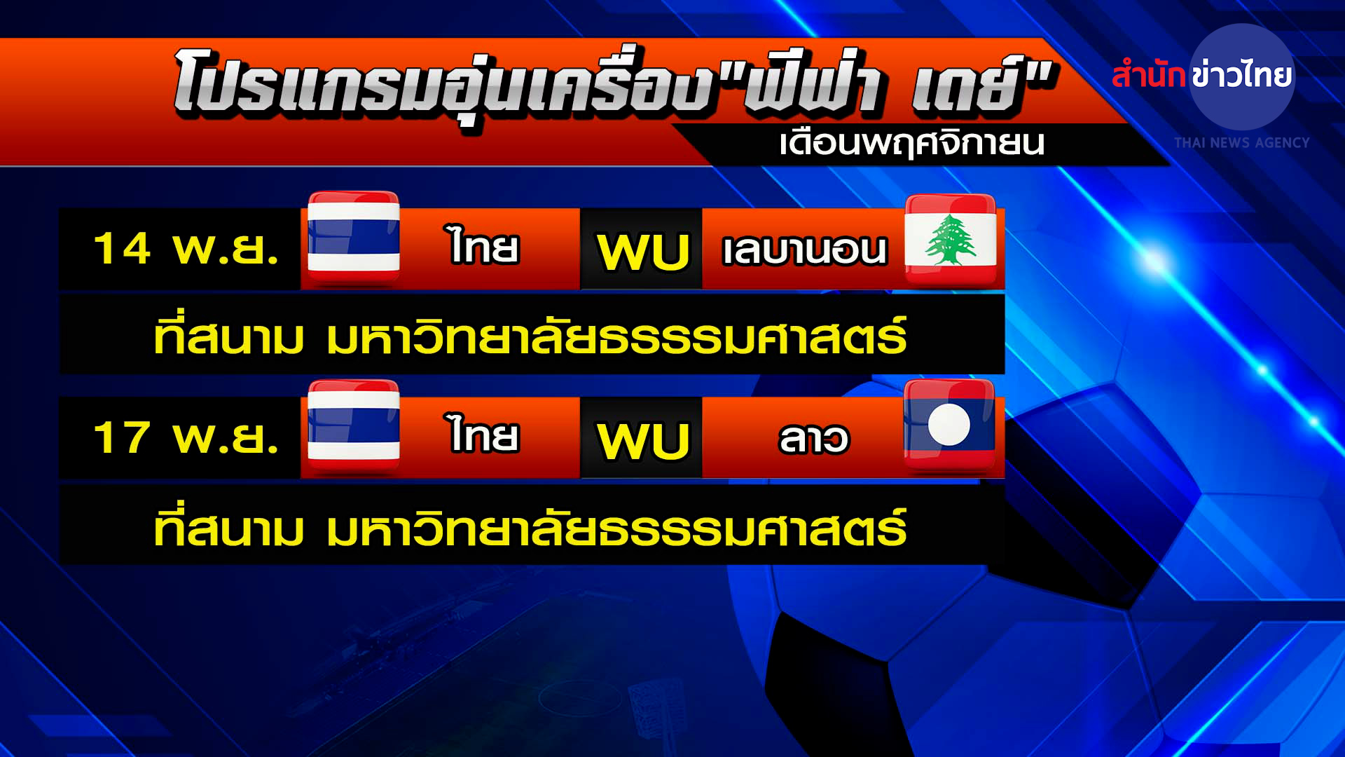 23 ต.ค.- ฟุตบอลชายทีมชาติไทย ชุดใหญ่ ได้โปรแกรมอุ่นเครื่อง 2 นัด พบ เลบานอนและลาว เกมฟีฟ่าเดย์เดือน พ.ย. เพื่อเตรียมทีมลุยศึกชิงแชมป์อาเซียน