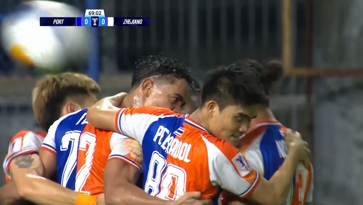 นาที 24 พีรดน ฉ่ำรัศมี ได้ลองยิงไกล แต่บอลไม่เข้ากรอบ ครึ่งหลัง นาทีที่ 69 เควิน ดีรมรัมย์ ลุยผ่านแนวรับเจ้อเจียง ก่อนเปิดจากสุดเส้นหลังไปที่เสาไกลให้ เฟลิเป อโมริม ยิงเข้าไปให้การท่าเรือ ออกนำ 1-0