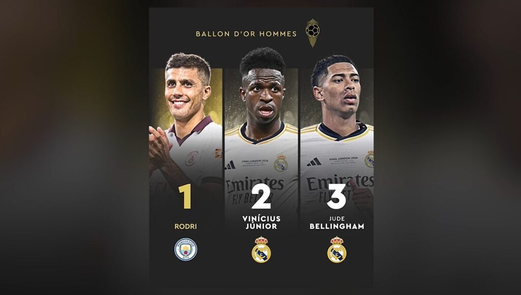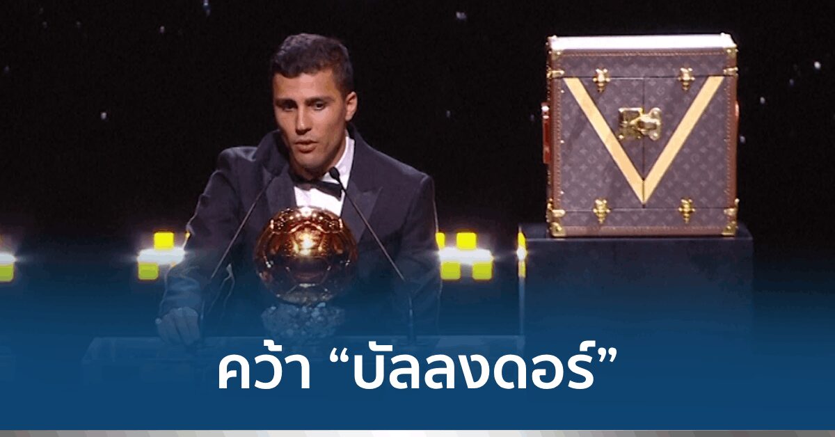 ฝรั่งเศส 29 ต.ค. – โรดรี้ กองกลางทีมชาติสเปน ของแมนฯ ซิตี้ คว้ารางวัลบัลลงดอร์ ของนิตยสารฟรองซ์ ฟุตบอล เบียดเอาชนะ วินิซิอุส จูเนียร์ แนวรุกทีมชาติบราซิล ของเรอัล มาดริด