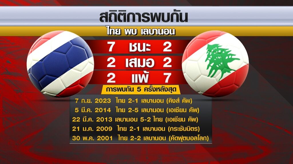 สถิติการพบกันทั้งหมด 11 เกม ไทยชนะ 7 เกม เสมอ 2 เกม เลบานอนชนะ 2 เกม ส่วนการพบกัน 5 ครั้งหลังสุด ผลัดกันแพ้ชนะทีมละ 2 นัด และเสมอกัน 1 นัด นัดล่าสุดที่พบกันในฟุตบอลคิงส์คัพ 2023 ไทยชนะเลบานอน 2-1 .-สำนักข่าวไทย