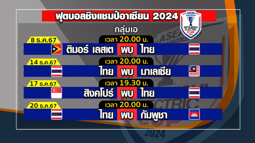 สำหรับทีมชาติไทย แชมป์เก่า อยู่กลุ่มเอ จะลงสนามนัดแรก พบติมอร์-เลสเต วันที่ 8 ธันวาคม ที่สนามฮัง เดย์ สเตเดียม ประเทศเวียดนาม จากนั้นวันที่ 14 ธันวาคม เล่นในบ้าน พบมาเลเซีย วันที่ 17 ธันวาคม ไปเยือนสิงคโปร์ และวันที่ 20 ธันวาคม กลับมาเล่นในบ้านพบกัมพูชา.-สำนักข่าวไทย