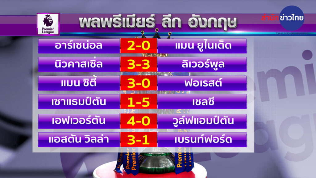 ฟุตบอลพรีเมียร์ลีก อังกฤษ คู่บิ๊กแมตช์ เมื่อคืนนี้ อาร์เซนอล เปิดบ้านเอาชนะ แมนเชสเตอร์ ยูไนเต็ด 2-0โดยปืนใหญ่ได้ 2 ประตูจากจังหวะเตะมุม จากเยอร์เรียน ทิมเบอร์ นาทีที่ 54 และโธมัส ปาร์เตย์ โหม่งแฉลบตัว วิลเลียม ซาลีบา เข้าไปนาทีที่ 73 จบเกม อาร์เซนอล ชนะ แมนฯ ยูไนเต็ด 2-0 มี 28 คะแนนจาก 14 นัดอยู่ที่ 3 ไล่จี้ ลิเวอร์พูล จ่าฝูงเหลือ 7 คะแนน ส่วน ปีศาจแดง อยู่อันดับ 11 มี 19 คะแนน