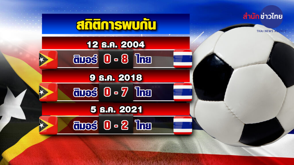 สำหรับสถิติการพบกันของไทย กับ ติมอร์ เลสเต ถือว่าไทยเหนือกว่ามาก เคยพบกันทั้งหมด 3 ครั้งในรายการนี้ ไทยชนะได้ทุกครั้ง ปี 2004 ไทยชนะ 8-0 ปี 2018 ไทยชนะ 7-0 และปี 2021 ไทยชนะ 2-0 ย้ำอีกครั้ง ศึกชิงแชมป์อาเซียน ทีมชาติไทย แชมป์เก่า และแชมป์ 7 สมัย อันดับ 97 ของโลก จะพบกับ ติมอร์ เลสเต อันดับ 196 ของโลก ที่ ฮัง เดย์ สเตเดียม วันนี้ เวลา 20.00 น.-สำนักข่าวไทย